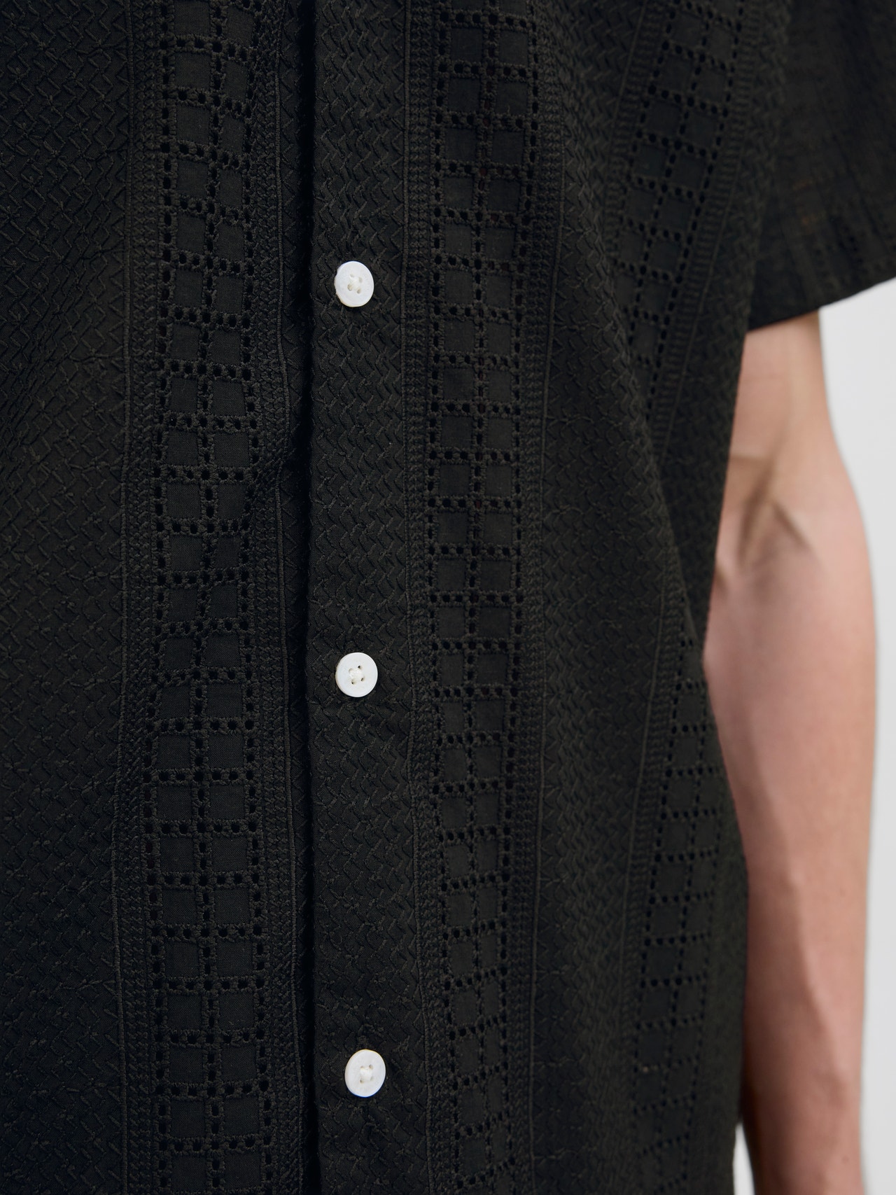 Dobby-kankaassa on pieniä geometrisiä kuvioita, jotka lisäävät tekstuuria hienostuneeseen ilmeeseen.