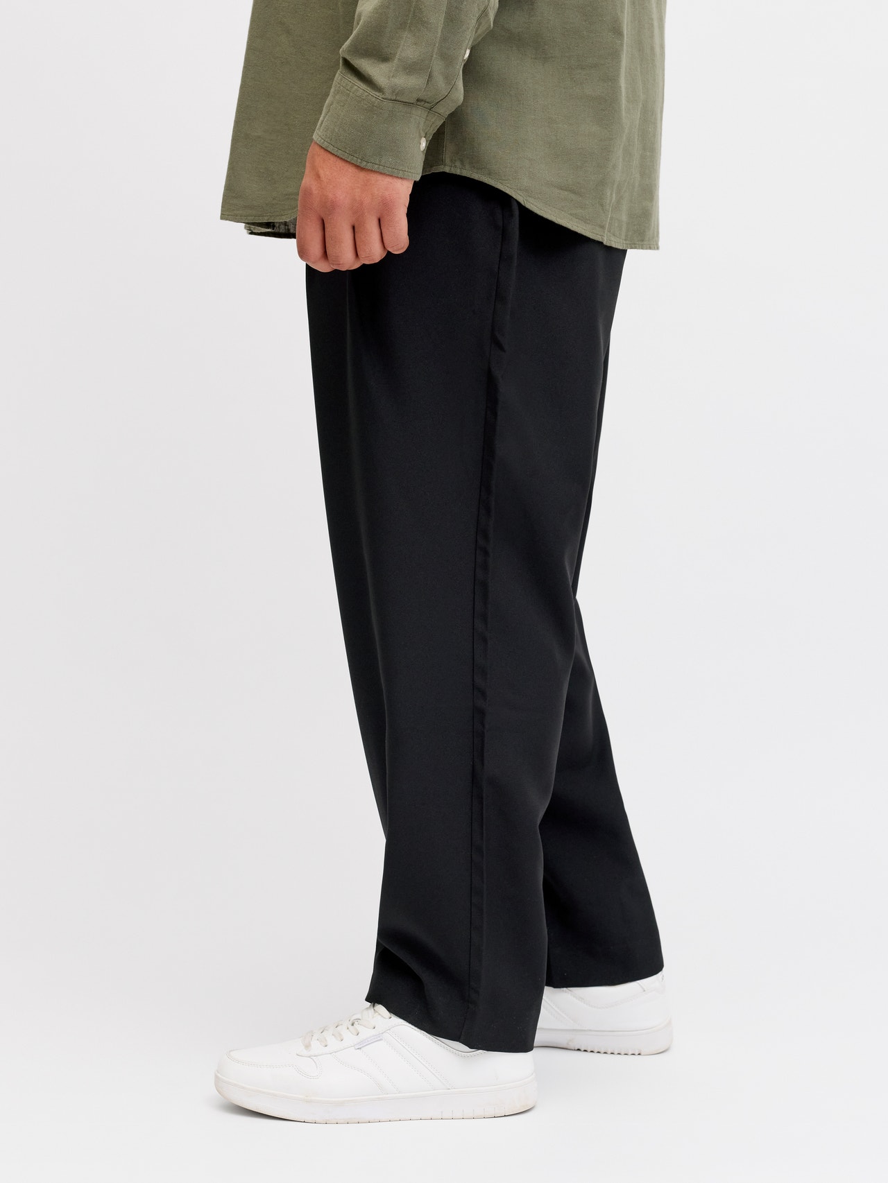 - Passform : Vid passform med hög midja, vida lår-, knä- och benöppning