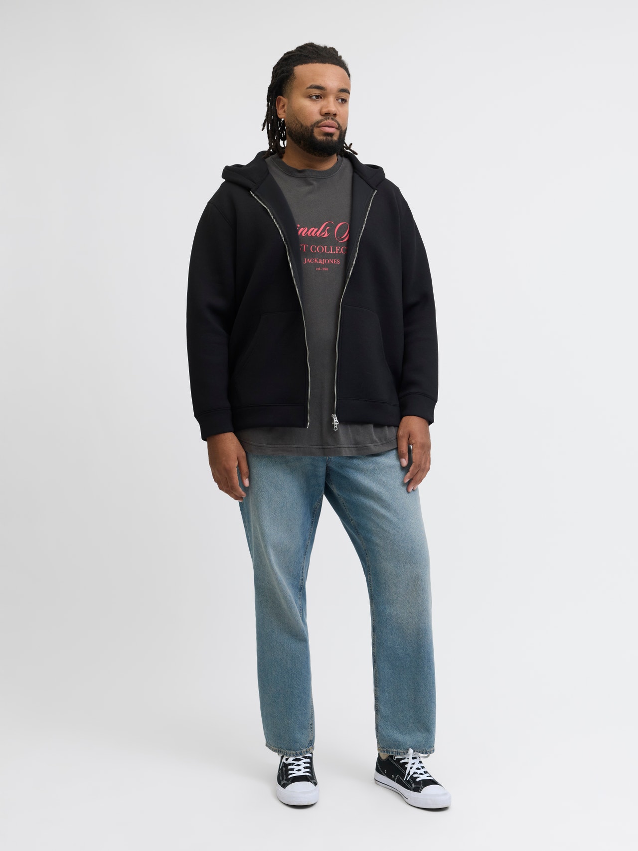 Vår modell är 198 cm lång och bär storlek EU3XL US1XL